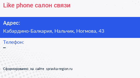 Like phone, салон связи по адресу Кабардино-Балкария, Нальчик, Ногмова, 43 в дальнейшем Организация, размещена в следующих категориях: