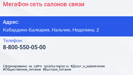 МегаФон, сеть салонов связи по адресу Кабардино-Балкария, Нальчик, Неделина, 2 в дальнейшем Организация, размещена в следующих категориях: