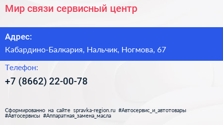 Мир связи, сервисный центр по адресу Кабардино-Балкария, Нальчик, Ногмова, 67 в дальнейшем Организация, размещена в следующих категориях:
