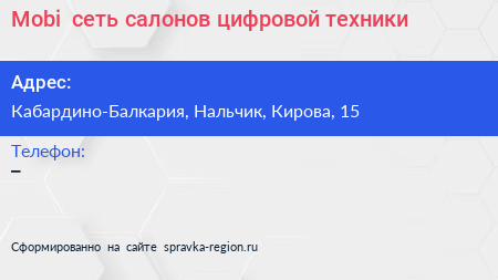 Mobi+, сеть салонов цифровой техники по адресу Кабардино-Балкария, Нальчик, Кирова, 15 в дальнейшем Организация, размещена в следующих категориях: