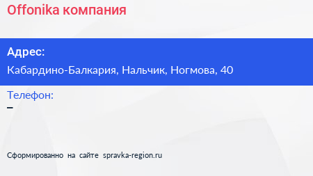 Offonika, компания по адресу Кабардино-Балкария, Нальчик, Ногмова, 40 в дальнейшем Организация, размещена в следующих категориях:
