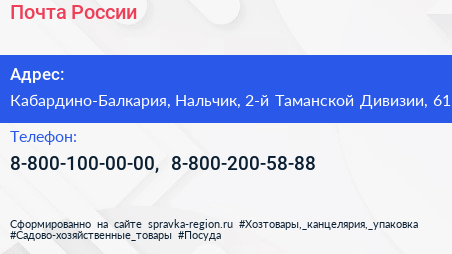 Почта России по адресу Кабардино-Балкария, Нальчик, 2-й Таманской Дивизии, 61 в дальнейшем Организация, размещена в следующих категориях: