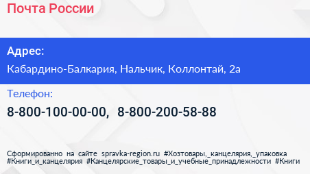 Почта России по адресу Кабардино-Балкария, Нальчик, Коллонтай, 2а в дальнейшем Организация, размещена в следующих категориях: