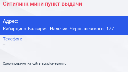 Ситилинк мини, пункт выдачи по адресу Кабардино-Балкария, Нальчик, Чернышевского, 177 в дальнейшем Организация, размещена в следующих категориях: