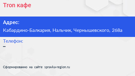 Tron, кафе по адресу Кабардино-Балкария, Нальчик, Чернышевского, 268а в дальнейшем Организация, размещена в следующих категориях: