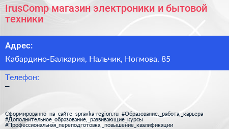 IrusComp, магазин электроники и бытовой техники по адресу Кабардино-Балкария, Нальчик, Ногмова, 85 в дальнейшем Организация, размещена в следующих категориях: