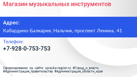 Магазин музыкальных инструментов по адресу Кабардино-Балкария, Нальчик, проспект Ленина, 41 в дальнейшем Организация, размещена в следующих категориях: