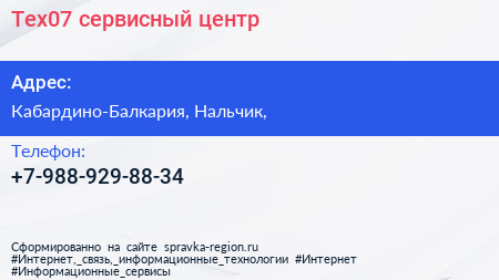 Тех07, сервисный центр по адресу Кабардино-Балкария, Нальчик, в дальнейшем Организация, размещена в следующих категориях: