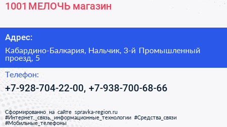 1001 МЕЛОЧЬ, магазин по адресу Кабардино-Балкария, Нальчик, 3-й Промышленный проезд, 5 в дальнейшем Организация, размещена в следующих категориях: