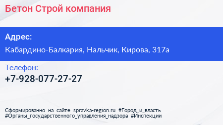 Бетон-Строй, компания по адресу Кабардино-Балкария, Нальчик, Кирова, 317а в дальнейшем Организация, размещена в следующих категориях: