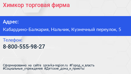 Химкор, торговая фирма по адресу Кабардино-Балкария, Нальчик, Кузнечный переулок, 5 в дальнейшем Организация, размещена в следующих категориях: