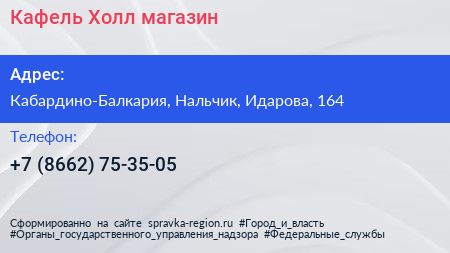 Кафель Холл, магазин по адресу Кабардино-Балкария, Нальчик, Идарова, 164 в дальнейшем Организация, размещена в следующих категориях: