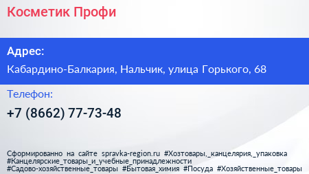 Косметик-Профи по адресу Кабардино-Балкария, Нальчик, улица Горького, 68 в дальнейшем Организация, размещена в следующих категориях: