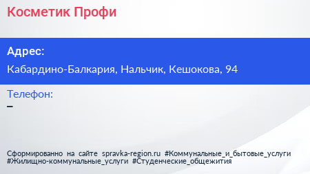 Косметик-Профи по адресу Кабардино-Балкария, Нальчик, Кешокова, 94 в дальнейшем Организация, размещена в следующих категориях: