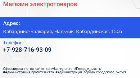 Магазин электротоваров по адресу Кабардино-Балкария, Нальчик, Кабардинская, 150а в дальнейшем Организация, размещена в следующих категориях: