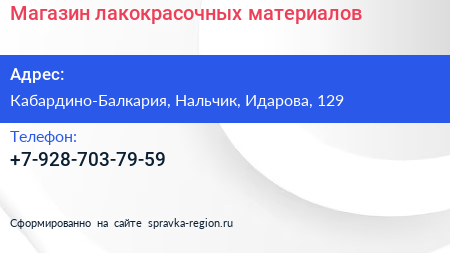 Магазин лакокрасочных материалов по адресу Кабардино-Балкария, Нальчик, Идарова, 129 в дальнейшем Организация, размещена в следующих категориях: