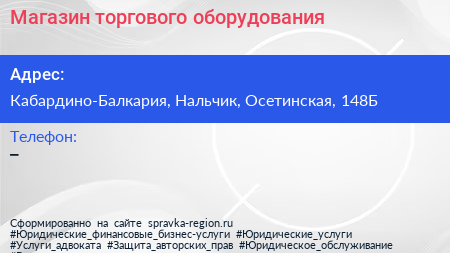 Магазин торгового оборудования по адресу Кабардино-Балкария, Нальчик, Осетинская, 148Б в дальнейшем Организация, размещена в следующих категориях: