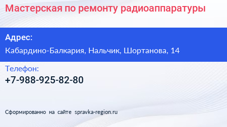 Мастерская по ремонту радиоаппаратуры по адресу Кабардино-Балкария, Нальчик, Шортанова, 14 в дальнейшем Организация, размещена в следующих категориях: