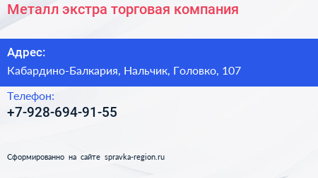 Металл экстра, торговая компания по адресу Кабардино-Балкария, Нальчик, Головко, 107 в дальнейшем Организация, размещена в следующих категориях:
