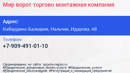 Мир ворот, торгово-монтажная компания по адресу Кабардино-Балкария, Нальчик, Идарова, 68 в дальнейшем Организация, размещена в следующих категориях: