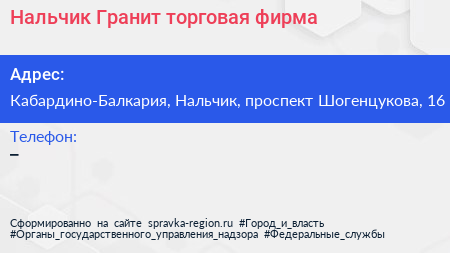 Нальчик Гранит, торговая фирма по адресу Кабардино-Балкария, Нальчик, проспект Шогенцукова, 16 в дальнейшем Организация, размещена в следующих категориях: