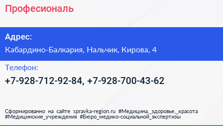 Професиональ по адресу Кабардино-Балкария, Нальчик, Кирова, 4 в дальнейшем Организация, размещена в следующих категориях: