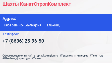 Шахты КанатСтропКомплект по адресу Кабардино-Балкария, Нальчик, в дальнейшем Организация, размещена в следующих категориях: