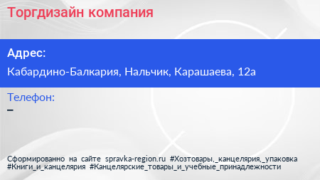 Торгдизайн, компания по адресу Кабардино-Балкария, Нальчик, Карашаева, 12а в дальнейшем Организация, размещена в следующих категориях: