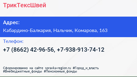 ТрикТексШвей по адресу Кабардино-Балкария, Нальчик, Комарова, 163 в дальнейшем Организация, размещена в следующих категориях:
