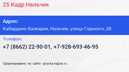 25 Кадр-Нальчик по адресу Кабардино-Балкария, Нальчик, улица Горького, 28 в дальнейшем Организация, размещена в следующих категориях: