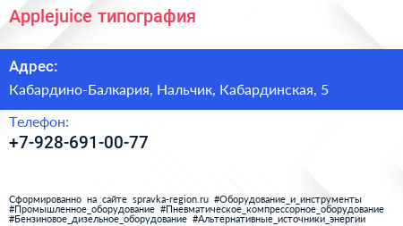 Applejuice, типография по адресу Кабардино-Балкария, Нальчик, Кабардинская, 5 в дальнейшем Организация, размещена в следующих категориях:
