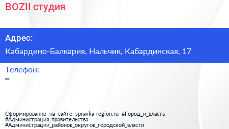 BOZII, студия по адресу Кабардино-Балкария, Нальчик, Кабардинская, 17 в дальнейшем Организация, размещена в следующих категориях: