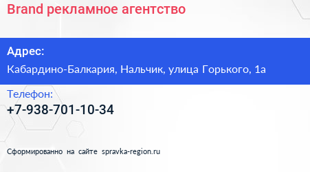 Brand, рекламное агентство по адресу Кабардино-Балкария, Нальчик, улица Горького, 1а в дальнейшем Организация, размещена в следующих категориях: