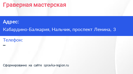 Граверная мастерская по адресу Кабардино-Балкария, Нальчик, проспект Ленина, 3 в дальнейшем Организация, размещена в следующих категориях: