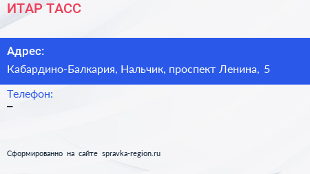 ИТАР-ТАСС по адресу Кабардино-Балкария, Нальчик, проспект Ленина, 5 в дальнейшем Организация, размещена в следующих категориях: