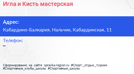 Игла и Кисть, мастерская по адресу Кабардино-Балкария, Нальчик, Кабардинская, 11 в дальнейшем Организация, размещена в следующих категориях: