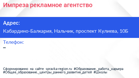 Импреза, рекламное агентство по адресу Кабардино-Балкария, Нальчик, проспект Кулиева, 10Б в дальнейшем Организация, размещена в следующих категориях: