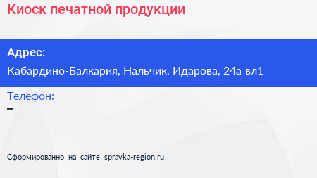 Киоск печатной продукции по адресу Кабардино-Балкария, Нальчик, Идарова, 24а вл1 в дальнейшем Организация, размещена в следующих категориях: