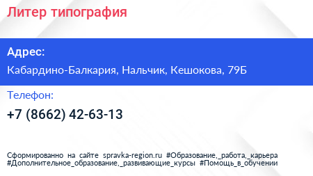 Литер, типография по адресу Кабардино-Балкария, Нальчик, Кешокова, 79Б в дальнейшем Организация, размещена в следующих категориях: