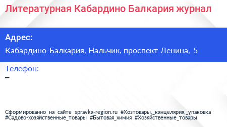 Литературная Кабардино-Балкария, журнал по адресу Кабардино-Балкария, Нальчик, проспект Ленина, 5 в дальнейшем Организация, размещена в следующих категориях: