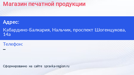 Магазин печатной продукции по адресу Кабардино-Балкария, Нальчик, проспект Шогенцукова, 14а в дальнейшем Организация, размещена в следующих категориях:
