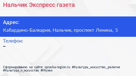 Нальчик Экспресс, газета по адресу Кабардино-Балкария, Нальчик, проспект Ленина, 5 в дальнейшем Организация, размещена в следующих категориях: