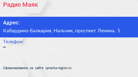 Радио Маяк по адресу Кабардино-Балкария, Нальчик, проспект Ленина, 5 в дальнейшем Организация, размещена в следующих категориях: