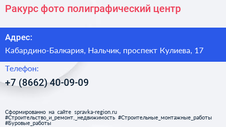 Ракурс, фото-полиграфический центр по адресу Кабардино-Балкария, Нальчик, проспект Кулиева, 17 в дальнейшем Организация, размещена в следующих категориях:
