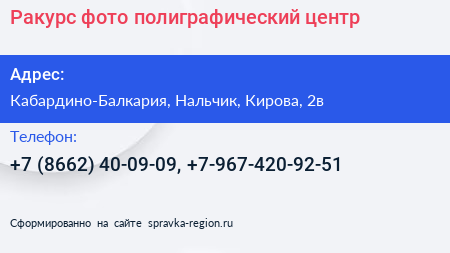Ракурс, фото-полиграфический центр по адресу Кабардино-Балкария, Нальчик, Кирова, 2в в дальнейшем Организация, размещена в следующих категориях: