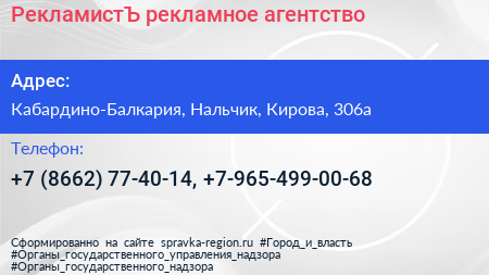 РекламистЪ, рекламное агентство по адресу Кабардино-Балкария, Нальчик, Кирова, 306а в дальнейшем Организация, размещена в следующих категориях: