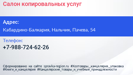 Салон копировальных услуг по адресу Кабардино-Балкария, Нальчик, Пачева, 54 в дальнейшем Организация, размещена в следующих категориях: