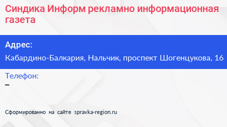 Синдика-Информ, рекламно-информационная газета по адресу Кабардино-Балкария, Нальчик, проспект Шогенцукова, 16 в дальнейшем Организация, размещена в следующих категориях: