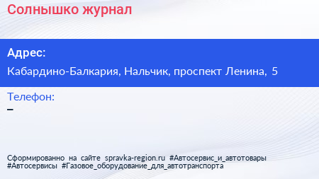 Солнышко, журнал по адресу Кабардино-Балкария, Нальчик, проспект Ленина, 5 в дальнейшем Организация, размещена в следующих категориях: