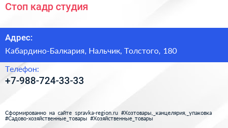 Стоп-кадр, студия по адресу Кабардино-Балкария, Нальчик, Толстого, 180 в дальнейшем Организация, размещена в следующих категориях: